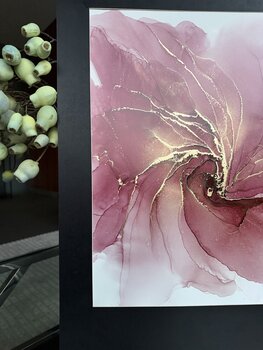 Anastasia Matas, met een sterke achtergrond in tekenen, maakt boeiende kunstwerken die vreugde en positieve energie uitstralen. Haar passie voor alcoholinkt bracht haar ertoe een unieke bloementechniek te ontwikkelen. Met vloeiende, glinsterende patronen en gouden accenten transformeert ze elk stuk in een unieke creatie die kunstliefhebbers betovert.