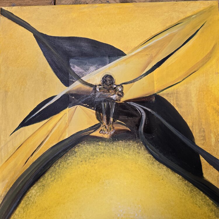 In dit schilderij meng ik op een gepassioneerde manier acryl en olieverf met collage-elementen. Ik wil een emotionele reis creëren door middel van symbolische en figuratieve voorstellingen. De krachtige zwarte tinten en het felle geel symboliseren de dynamiek van innerlijke strijd. De gehurkte man zit boven de drukke straten zonder de mogelijkheid er te komen - zelfs als ze op zijn niveau blijven. Het symboliseert de wanhoop van de mensen die aan… hun reis beginnen. Daartegenover staat het heldere geel, de kleur van licht en warmte.