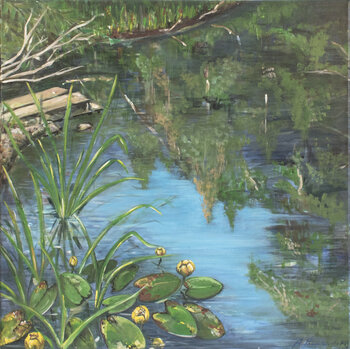 Dit schilderij is een eerbetoon aan de sereniteit en harmonie van de natuur. Het kalme water weerspiegelt de omringende wereld en versmelt de realiteit met de weerspiegeling ervan. Felgroene waterlelies en zachte lichttinten creëren diepte en rust. Perfect voor zowel eco-stijl als klassieke interieurs, het brengt frisheid en balans in elke ruimte.