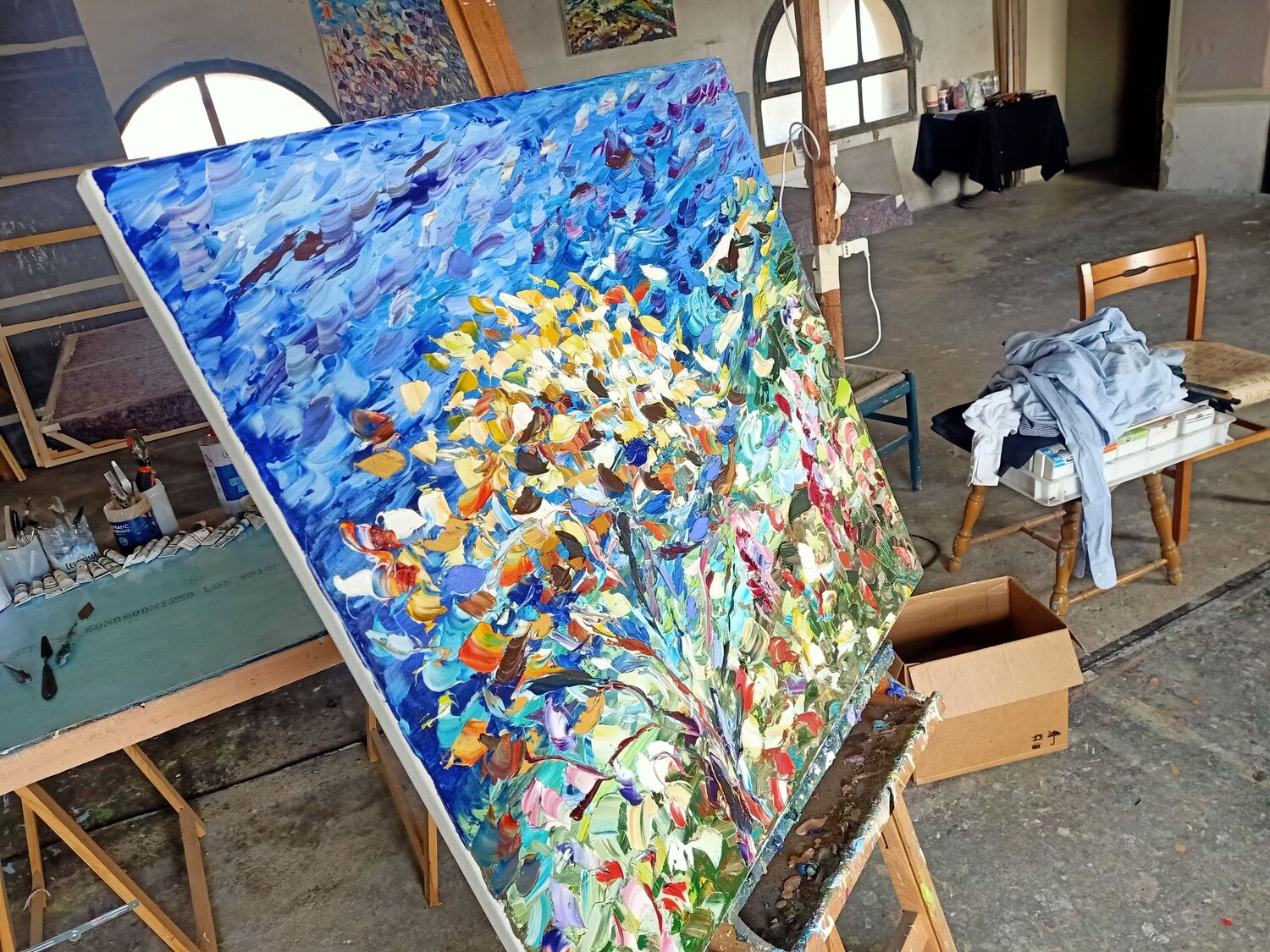In mijn werk heb ik mijn passie voor de natuur gekanaliseerd door de schoonheid ervan krachtig tot uitdrukking te brengen door middel van heldere kleuren en expressionistische accenten. Ik probeerde de levendige essentie van het leven vast te leggen door gedurfd gebruik van kleur en beweging, waarbij ik inspiratie putte uit het impressionisme en het fauvisme om een gevoel van onuitputtelijke energie over te brengen. Dit schilderij brengt frisheid… en dynamiek in huis en roept intense emoties en een sfeer van pure vreugde op.