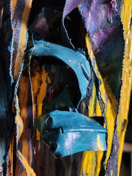 Bovenaan wordt de Sisyphus-vorm compacter. Gescheurde, hangende fragmenten van materiaal (canvas) omhullen en bedekken de kern.
