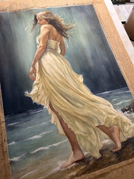 “Voor de storm” toont een rustig, bijna tijdloos moment aan zee – vlak voordat het weer omslaat. De figuur beweegt zich kalm langs de kust, omgeven door zacht licht, terwijl in de verte regen dreigt en de wind haar jurk en haar al in beweging brengt.