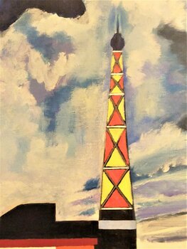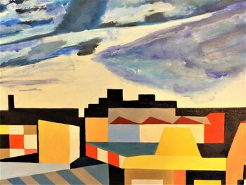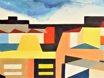 De stad is geschilderd als een bouwspel, met kubussen, driehoeken, rechthoeken, rechte lijnen en natuurlijk een kleureenheid: blauw, Napelsgeel en een beetje okerkleurig en… roze om 'verzacht de functies.