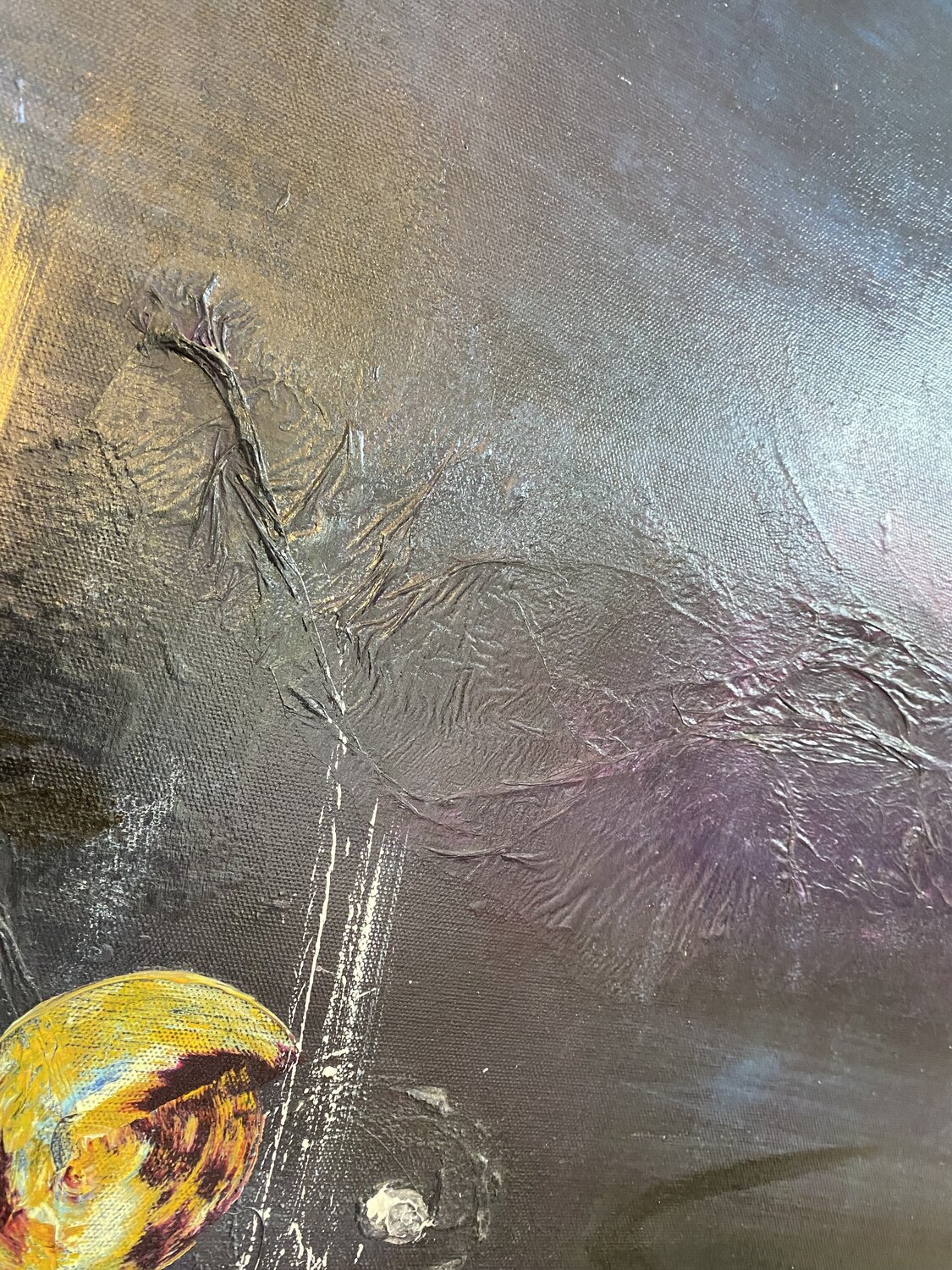 « "Elk canvas nodigt me uit voor een reis die ik ontdek terwijl het vordert. Mijn hand laat een groot deel aan het toeval over, mijn hand leidt mijn emoties op canvas, als muzieknoten." »