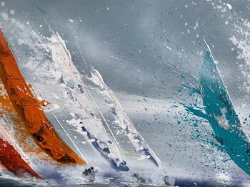 Aan de horizon toont een regatta een tiental zeilboten in felle kleuren, die uiteenvallen tegen een blauwgrijze lucht, onder invloed van snelheid en wind.