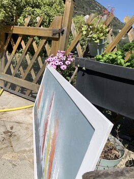 Kunstwerk niet opgehangen, maar al omlijst en klaar om op te hangen.