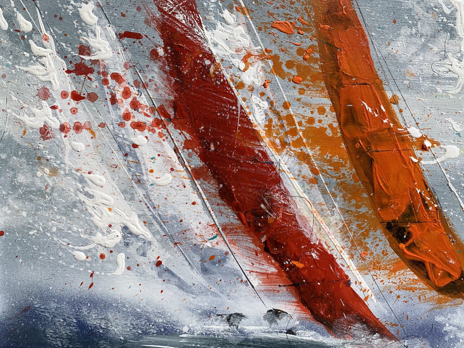 Tussen abstracte kunst en figuratieve kunst komt deze compositie tot stand met mes, penseel en spuitbus. De beweging wordt gesuggereerd met de druppeltechniek.