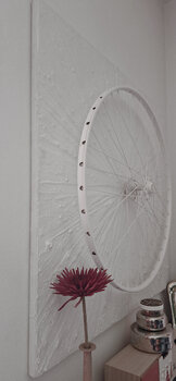 Met dit werk wilde ik de essentie van beweging en stilte onderzoeken. Door het gebruik van acryl en gips creëerde ik een visueel vlak waarin het fietswiel samensmelt met de minimalistische achtergrond, verwijzend naar continuïteit en de cyclus van het leven. Elke penseelstreek en elk toegevoegd object bevat een reflectie op vergankelijkheid en onveranderlijkheid, waardoor de toeschouwer wordt uitgenodigd om na te denken over zijn eigen pad via een… even rustige als suggestieve uitdrukking. Tijdloos werk opgedragen aan Fabio Casartelli - Tour de France 1995. Totaal wit. De fietsvelg wordt op een persoon bevestigd en draait vanzelf. Door te draaien creëren de stralen dezelfde geometrie die ik rechtstreeks op het canvas heb gemaakt. Met gericht licht ontstaan cirkelvormige schaduwen. Het werk houdt het midden tussen schilderkunst en beeldhouwkunst. Het werk werd gedemonteerd en opnieuw geschilderd.