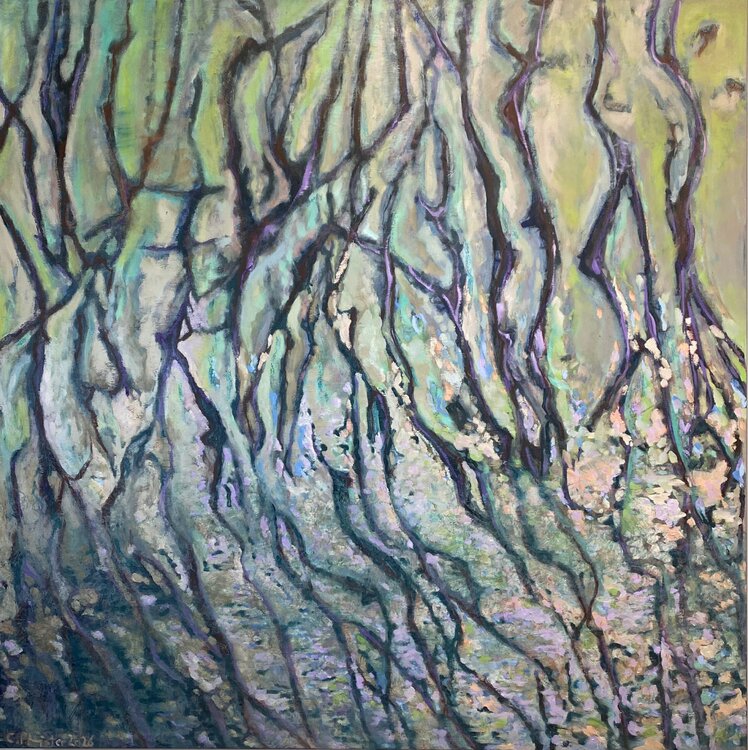 Glinsterend water spoelt rond de blootliggende wortels in het struikgewas van een oeverbos, een labyrintisch wirwar van wortels, het onbegaanbare struikgewas in tropische wateren. Het dichte wortelstelsel lijkt van binnenuit te gloeien, als een netwerk van zenuwstrengen met gloeiende synapsen. Het beeld is een uitdrukking van de dichte wortels van alle levende wezens, en soms ook van de ondoorgrondelijke chaos daarin: geworteld in de aarde groeien… levensbomen naast elkaar, wild verwrongen in het licht.