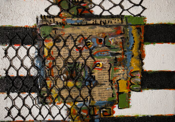 Between Black and White maakt deel uit van de serie Urban Fragments en is gemaakt op canvas, waarbij gebruik is gemaakt van draadgaas en diverse andere materialen.