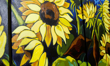 Mijn werk is een levendige viering van het leven, gemanifesteerd in gloeiende zonnebloemen. Ik heb acrylverf gebruikt om de kracht en passie vast te leggen van deze bloemen die ronddraaien en de zon volgen. Geïnspireerd door het expressionisme en het fauvisme probeer ik optimisme en de overvloeiende energie van de natuur over te brengen. Deze bloemen symboliseren doorzettingsvermogen en positiviteit die elke ruimte die u besluit te bewonen met licht… en warmte zullen vullen.