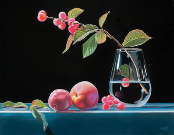 Ik ontwikkelde dit beeld vanuit een simpel moment: een tak in een glas, te zwaar voor het glas, te levend om stil te staan. Deze spanning intrigeerde me. Alles lijkt kalm, maar niets is werkelijk stabiel. De tak blijft op zijn plek, zelfs als hij omvalt. Het fruit ligt stevig, maar lijkt verwisselbaar.