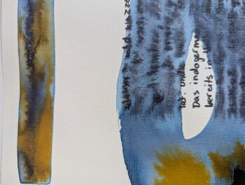 Een van mijn inspiratiebronnen is de reis terug naar de oorsprong van woorden en objecten. Deze reizen naar het verleden, die me door zoveel landen en culturen voeren, tonen me de verbazingwekkende diepte en complexiteit van het alledaagse, 'gewone', dat zelden zo gewoon is als het op het eerste gezicht lijkt. Tijdens die reizen leer ik ook hoe de betekenis van woorden in de loop der tijd kan veranderen, hoe vloeiend een taal is. Het ervaren van… deze veranderingen is vaak een eyeopener en zeer verrijkend. In deze serie wil ik de vloeiendheid van taal visueel weergeven. Etymologische studies naar de oorsprong en geschiedenis van woorden – geschreven met viltstift op aquarelpapier – dienen als basis voor dit werk. Daarna worden aquarel en inkt in eenvoudige vormen aangebracht, waardoor de tekst kan vloeien en hervormen.