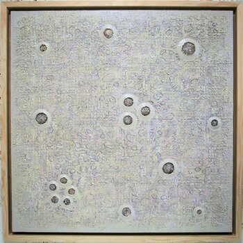 Bij het maken van dit stuk heb ik me verdiept in een wereld van texturen en contrasten, waarbij ik acryl heb gebruikt om mijn surrealistische visie tot leven te brengen. Elke streek en elk symbool is geladen met emotie en nodigt uit tot interpretatie en introspectie. De cirkelvormige motieven suggereren continuïteit en de kosmos, terwijl de gevarieerde texturen een dynamiek creëren die zowel sereen als ontroerend is. Dit schilderij is een gespreksonderwerp… dat elke ruimte energie geeft en kijkers meetrekt in een dans van vorm en betekenis.
