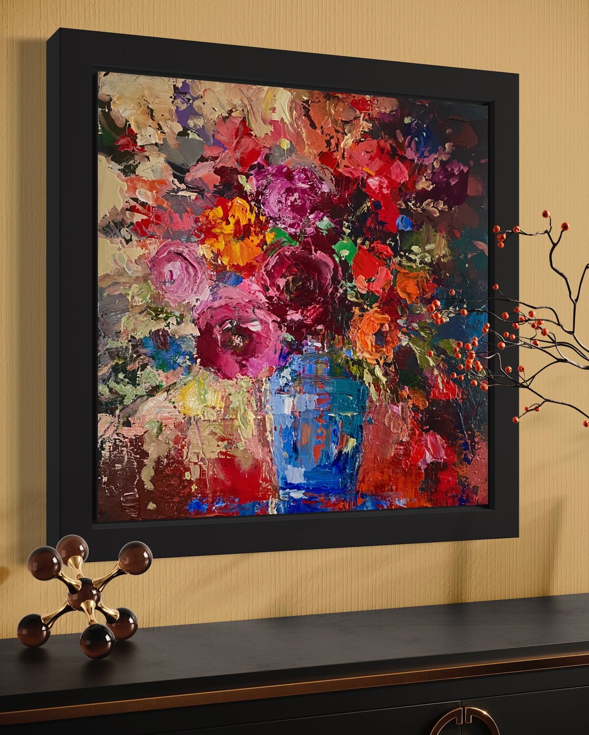 In dit levendige olieverfschilderij heb ik geprobeerd de dynamische en vluchtige aard van de schoonheid van een boeket vast te leggen. De gestructureerde penseelstreken en gedurfde, impressionistische vormen belichamen de energie en vreugde die bloemen in ons leven brengen. Elke penseelstreek is een viering van kleur en emotie, ontworpen om een gevoel van warmte en uitbundigheid op te roepen in het hart van de kijker. Dit stuk is bedoeld om te bloeien… met leven, waar het ook wordt geplaatst, en voegt een uitbarsting van inspiratie en passie toe aan elke ruimte.
