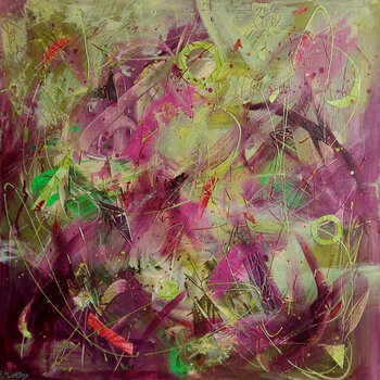 “Lila geur”. Hier werd ik geïnspireerd door de geur van een seringenboom die in de lente bloeit en zijn intense geur door de wind door de tuin wordt verspreid. Het resultaat was een dynamische en levendige presentatie. Mijn manier van werken is zeer energiek, ik gebruik penselen en spatels om de kleuren in alle richtingen aan te brengen. Er zijn enkele kleine collage-elementen in de foto geïntegreerd, die een hoogtepunt in het werk lijken. Dunne… lijnen geschilderd met metallic pennen geven het kunstwerk een nog dynamischer uiterlijk.