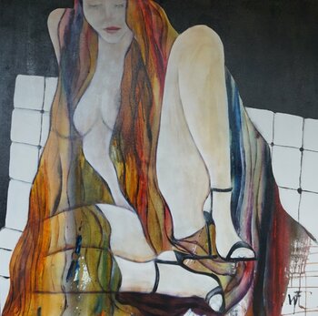 Friedrich Wurm schilderde hier een zittend naakt met een jas. De hoge hakken van de dame geven de foto zijn naam. Bovenal schilderde Friedrich Wurm de mantel in zijn techniek "Avontuur in het hoofd". Dit resulteerde in een mantel in fantastische aardekleuren. Deze handeling ademt een vleugje erotiek uit zonder iets te tonen. Juist het verbergen van lichaamsdelen dat karakteriseert het Bestanden van Friedrich Wurm en maakt ze mysterieus en spannend… voor de kijker