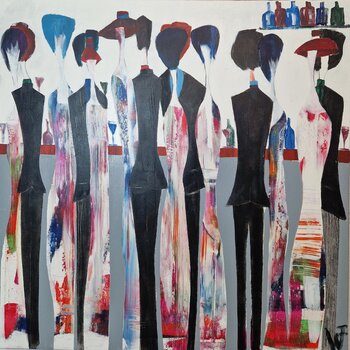 In mijn werk gebruik ik acrylverf om een semi-abstracte, figuratieve weergave te creëren van gestileerde mensen in pak. Deze compositie speelt met de anonimiteit en uniformiteit van moderne samenlevingen, met de gezichtsloosheid van de figuren die een universele menselijkheid suggereren. De levendige, soms oplossende kleuren brengen dynamiek en emotionaliteit in het spel en weerspiegelen individuele strijd en de schoonheid van de menselijke geest.… Dit kunstwerk is zowel krachtig als uitnodigend en voegt een diepe, emotionele aanwezigheid toe aan elke kamer.
