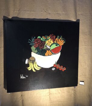 In totaal heb ik acht grote werken in Ghana geschilderd. Een daarvan is deze fruitmand met een donkerbruine achtergrond. Alle werken die ik in Ghana heb gemaakt, zijn uitsluitend met mijn vingers geschilderd. Ik heb alleen een klein stukje hout gebruikt als hulpmiddel voor de contouren.