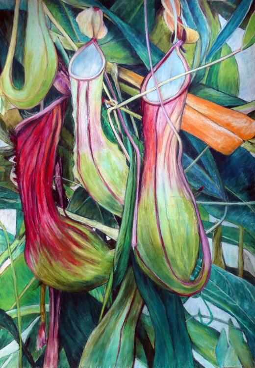 In dit werk heb ik de fascinerende wereld van vleesetende planten vastgelegd. Met pastel en houtskool wilde ik hun unieke schoonheid en levendige aanwezigheid benadrukken, bijna alsof ze elk moment kunnen ontwaken. De vormen lijken op natuurlijke sculpturen, die spanning en mysterie uitstralen – ze brengen een wilde, dynamische energie in elke ruimte, doordrenkt met hun bijzondere kracht.