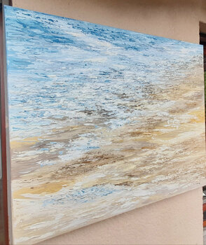 Lichtblauw, marineblauw, nautisch, intens blauw en wit worden gemengd met zand, beige, mosterd, sterke bruine kleuren, waardoor een optisch effect ontstaat dat een strand laat zien, een mooie zomerdag met een stralende zon die het zand en het water van de zee die het met zijn kalme golven bevochtigt en vormt zoals het wil.