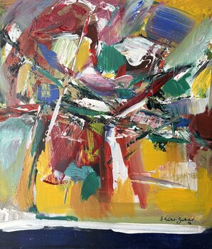 Er is een levendige compositie ontstaan, zoiets als een kleurrijk boeket van dankbaarheid. De dynamische penseelstreken en een krachtig kleurenpalet brengen emotie en energie over. Dit beeld is een uitnodiging om de diepe lagen van emotie en spontaniteit die in ons allemaal bestaan te verkennen en te vieren.