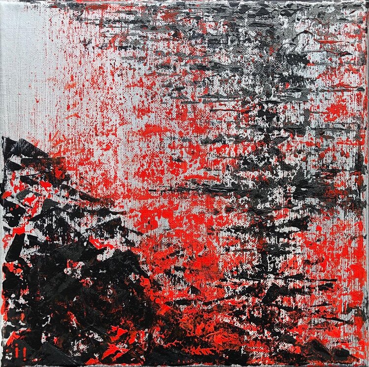 Hier heb ik een rauwe, minerale energie tot uitdrukking gebracht, vermengd met een intense spanning tussen het gloeiende vuur van gesmolten lava en het antracietgrijs van een opstijgende, rokerige hydra. Het vurige rood vermengt zich met zwart en metallic antraciet tegen een achtergrond van metallic zilververf om een innerlijke explosie, een latente passie, te suggereren. Dit werk brengt een krachtige vibratie en een dramatische uitstraling in uw… ruimte, uitnodigend tot reflectie en de emotie die vulkanen oproepen.