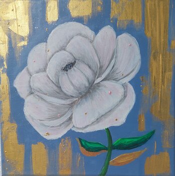 In mijn kunstwerk bracht ik de delicate pioen tot leven in abstracte accenten en met een spel van acrylkleuren. Deze bloem straalt met zijn zachte witte tinten en dynamische gouden achtergrondtexturen elegantie en puurheid uit. Het contrast tussen de delicate textuur van de bloemblaadjes en de gedurfde, bijna metaalachtige blauwe tinten zorgt voor een boeiende visuele ervaring. Dit schilderij symboliseert groei en vernieuwing en zal in elke kamer… een sfeer van frisheid en inspiratie verspreiden.