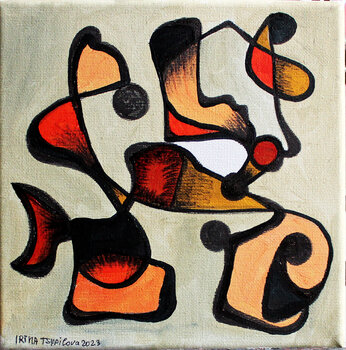 Haar recente serie contrasteert heldere, vrije vormen met vloeiende zwarte lijnen, en combineert zo abstractie met gecontroleerd design. Irina staat bekend om surrealistische composities – zoals siroop die uit kaas stroomt of een peer op een gloeiende kubus – die haar fascinatie voor de filosofische diepgang van absurde en eenvoudige vormen weerspiegelen.