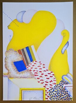 Kleurenlithografie op handgemaakt papier met rafelige randen.
