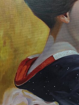 In dit olieverfschilderij leg ik de serene gratie van een geisha vast, gehuld in een gouden aura die warmte en mysterie uitstraalt. Mijn penseelstreken in figuratieve, impressionistische en realistische stijlen vermengen zich om haar delicate houding en de subtiele complexiteit van haar expressie te benadrukken. Dit kunstwerk nodigt uit tot contemplatie en voegt een vleugje tijdloze elegantie en culturele rijkdom toe aan elke ruimte die het siert.