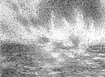 In deze sterk gestructureerde tekening opent zich een weids landschap. Hemel en aarde lijken in elkaar te grijpen. Vanaf de randen van de afbeelding ontwikkelen de gebeurtenissen zich tot het middelpunt van de tekening. Aan de randen, nog steeds dicht verdicht, worden de structuren dynamischer en opener naar het midden. Onderdelen van hemel en aarde komen samen en versmelten.