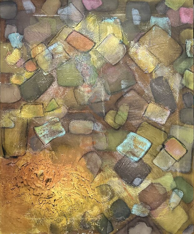 In dit stuk heb ik lagen acryl en oliepastel samengevoegd om een tapijt van gedempte aardtinten en getextureerde vormen te weven, wat een gevoel van herinnering en versleten tijd oproept. De keuze van abstracte vormen en symbolische elementen suggereert de gefragmenteerde, vaak ongrijpbare aard van onze herinneringen en eerdere ervaringen. Het is ontworpen om contemplatie en introspectie op te roepen, en idealiter een doordachte, zielroerende energie… te brengen in elke ruimte waarin het zich bevindt.