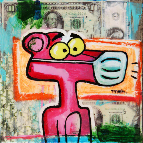 Mijn kunstwerk is een levendige collage gemaakt van acryl, verf en spray waarin pop-art en komische stijlen worden gebruikt. De felle kleuren en energieke vormen belichamen een jeugdige rebellie tegen conventies. Met een ironische toets door het woord "meh" twijfel ik aan de waarde van materiële dingen. Dit beeld zal een sfeervolle aanwezigheid in uw ruimte brengen en stimulerende gedachten uitlokken over het dagelijks leven en onze houding ten opzichte… daarvan.
