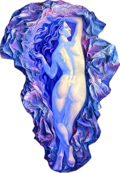 De “Maan” brengt een gevoel van vrouwelijke energie en harmonie over, verweven in de levendige golven van de natuur. De figuur, gehuld in vloeiende stromen, lijkt op te lossen in de vloeiende beweging van water en lucht, wat de verbinding van de mens met natuurlijke ritmes weerspiegelt. De plooien van de stof creëren dynamiek en benadrukken de zachtheid van vormen en de beweging van energieën, wat zowel ontspannend als stimulerend is.