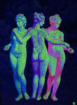 "The Three Graces" zijn mijn interpretatie van een beroemd beeldhouwwerk. Het werk is gemaakt van acryl en fluorescerend acryl op canvas in pointillistische stijl. De foto's tonen het werk in twee lichtmogelijkheden: bij daglicht en in het donker met ultraviolet licht. Zo kon je twee totaal verschillende werken zien door de belichting te veranderen.