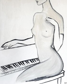 In het schilderij "La pianiste" wilde ik de harmonie tussen muziek en vrouwelijke gratie overbrengen, door een minimalistische stijl en verfijnde lijnen te gebruiken. De vrouwelijke figuur die aan de piano zit, belichaamt elegantie en vloeiende bewegingen, weerspiegeld in de zachte rondingen van haar lichaam en de delicate lijn die haar contouren accentueert. Er wordt speciale aandacht besteed aan de weergave van de borsten van de vrouw, waarbij… de natuurlijkheid en sensualiteit van het beeld worden benadrukt, waardoor een balans ontstaat tussen kwetsbaarheid en kracht. De zachte beige toon van haar huid voegt warmte en tederheid toe, in contrast met de scherpe zwarte lijnen.