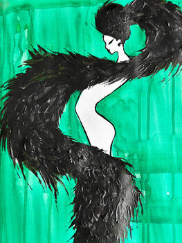 In dit elegante werk heb ik een Art Deco-visie van een abstracte vrouw uitgebeeld, balancerend tussen retrostijl en klassieke chic. De compositie toont een semi-abstracte vrouw wiens vrouwelijke figuur naar voren komt in gewaagde rondingen, die de schoonheid van het naakte vrouwenlichaam vieren. Haar delicate portret hint naar een tijdloze elegantie, terwijl haar gezicht de uitstraling van een cabaretdanseres heeft. Omringd door glamoureuze donkere… veren wordt ze zowel een muze als een performer, en roept ze de sfeer van cabaret op met mysterie en allure. De smaragdgroene achtergrond met druipende texturen creëert een dramatisch contrast en versterkt het sensuele ritme van haar silhouet. Ik wilde de sensualiteit van de vrouwelijke heupen, de subtiele aanwezigheid van de vrouwelijke billen en de gratie van de vrouwelijke vorm in beweging benadrukken. Dit schilderij legt de essentie vast van een cabaretdanseres gehuld in glamour, waar abstractie en vrouwelijkheid verweven zijn. Het is mijn interpretatie van een vrouw die tegelijkertijd sterk en kwetsbaar is.