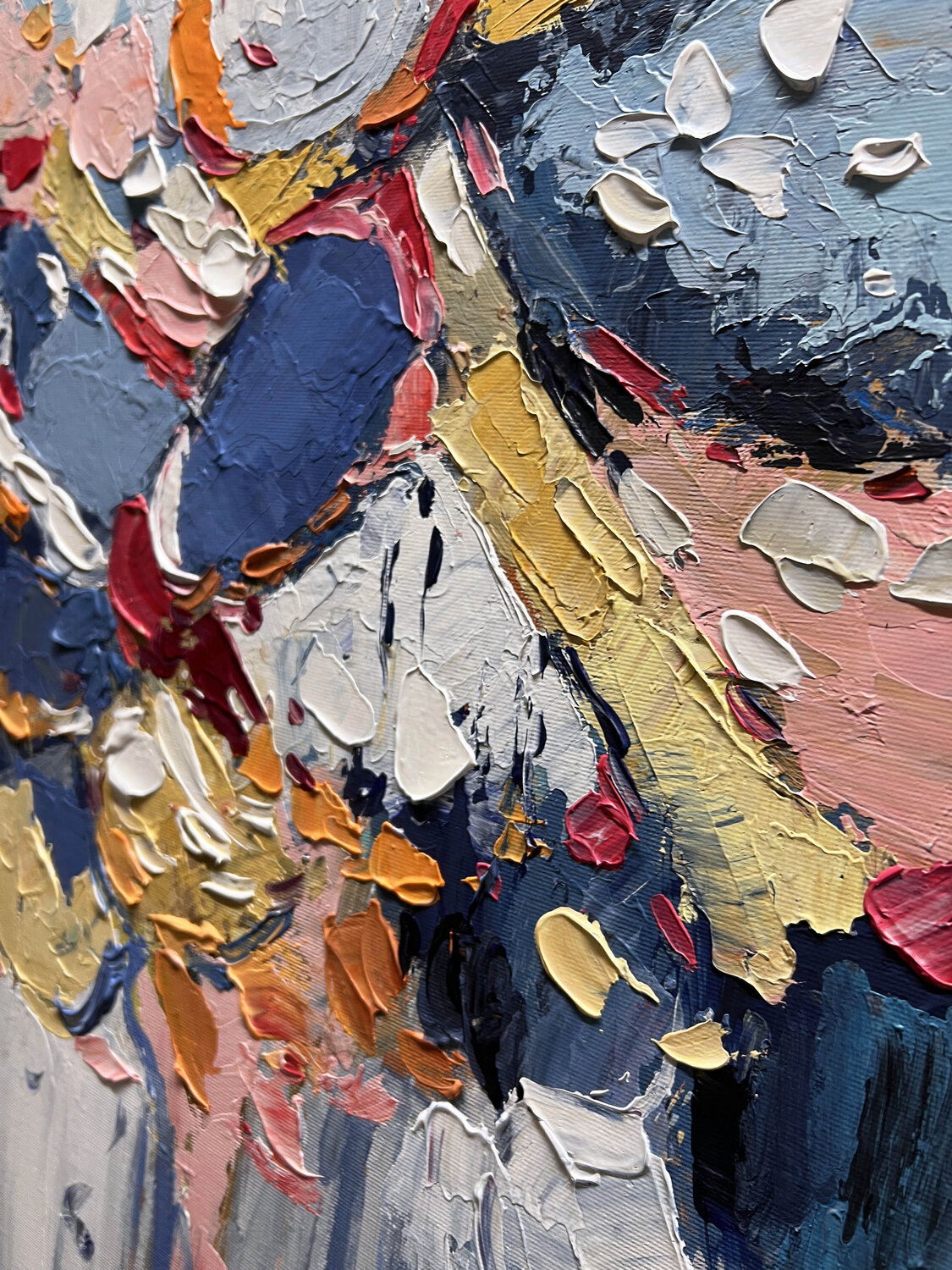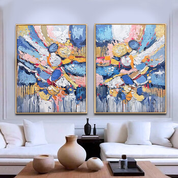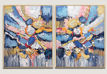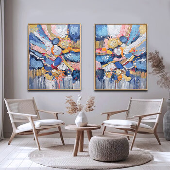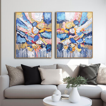 Zachte hemelsblauwe en diepe indigotinten creëren een open, vredige achtergrond, terwijl gelaagde accenten van goud, crème, warm amber, zacht turkoois en roze zich als licht door de lucht over beide schilderijen verspreiden. De rijke textuur, aangebracht met een paletmes, vormt een sculpturaal oppervlak dat levendig, expressief, tastbaar en vol beweging aanvoelt, alsof… het licht van het ene doek naar het andere overgaat.