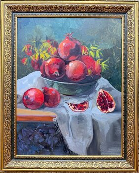 In “Luminous Pomegranates” toon ik een stilleven van glanzend fruit tegen een achtergrond van diepgroene en smaragdgroene tinten. De granaatappels stralen een zachte, innerlijke gloed uit, hun rijke oppervlakken vangen licht en kleur op en creëren een gevoel van diepte en elegantie.