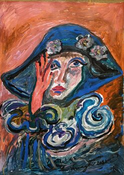 In dit werk verkende ik, door het impulsieve gebruik van acrylverf op papier, de levendigheid van het fauvisme met de intensiteit van het expressionisme. De diepblauwe kap, versierd met bloemen, omlijst het peinzende gezicht, een symbool van introspectie en mysterie. Rood en blauw botsen, en vertellen een innerlijke strijd, vol emoties. Het is een werk dat de toeschouwer uitnodigt om na te denken over zijn of haar eigen innerlijke complexiteit.
