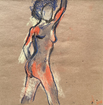 Bij het maken van dit stuk heb ik mij verdiept in een speelse maar diepgaande verkenning van de menselijke vorm. De rauwe energie van pastel en potlood danst op het getextureerde papier en legt een bewegend figuur vast – ongeraffineerd en levendig. Dit werk nodigt kijkers uit in een surrealistisch, primitief verhaal dat hen aanmoedigt de eenvoud en schoonheid van instinctieve expressie te omarmen. Het zal een levendige uitbarsting van leven en gesprek…