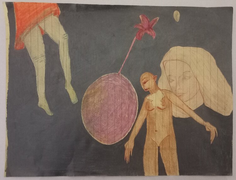 Ambitie zonder grootsheid: een vrouw met een gat in haar hart symboliseert mijn psychose en mijn onvermogen om mensen te vertrouwen en van hen te houden. Het hoofd van de vrouw met fijn haar symboliseert mijn liefde voor vrouwen en mijn wens om meer op hen te lijken, niet alleen mooier, maar ook makkelijker – iets wat mijn psychische aandoening me absoluut niet toestaat. Er is een bloem op een bolvormig ovaal, die de wereld en haar natuurlijke ambitie… om dingen groots te maken symboliseert, iets wat ik (de naakte vrouw met het gat) helemaal niet heb; ik heb wel ambitie, maar zonder grootsheid. De benen symboliseren mijn verlangen om met beide benen op de grond te staan.