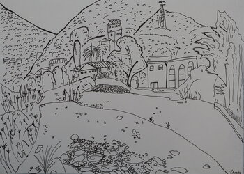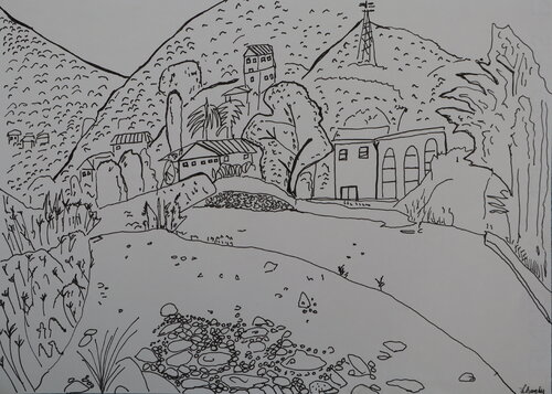 In dit werk wilde ik de puurheid en eenvoud van het grafische teken onderzoeken, door uitsluitend gebruik te maken van dunne zwarte lijnen tegen een witte achtergrond. Deze stilistische keuze werd ingegeven door de wens om de essentie van de vorm te benadrukken, zonder kleurafleidingen of schaduwen, en de kijker uit te nodigen tot een meer intieme en meditatieve lezing van het afgebeelde landschap.