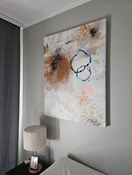 Dit lichte… schilderij ziet er extra bijzonder uit op een geschilderde muur, zoals de grijze muur in haar slaapkamer.