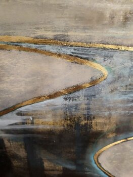 In dit schilderij wilde ik de melancholie en hoop van een lange innerlijke reis vastleggen, door met bladgoud een lichtgevend pad te tekenen door een wazig, bijna ondefinieerbaar landschap. Olieverf en was zorgen voor diepte en mysterie, terwijl goud een subtiel licht geeft dat de blik en het hart leidt naar iets kostbaars en verborgens. Een uitnodiging om jezelf te verliezen om jezelf terug te vinden.