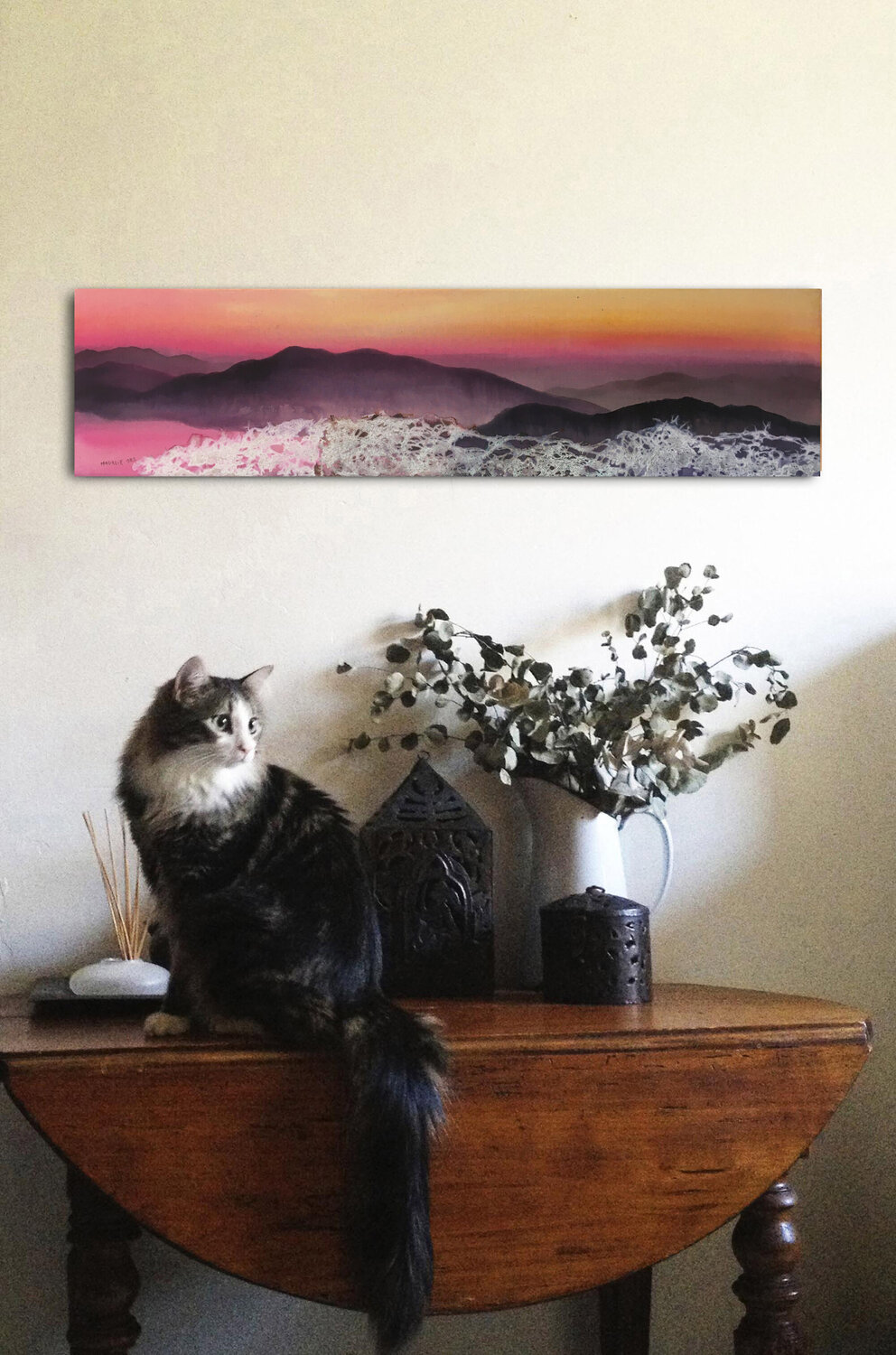 De zachte schoonheid van een opkomende zon midden in de bergen, het eerste daglicht dat de duisternis verjaagt om de valleien te verwarmen. Het werk heeft geen stropdas op de rug. Ophangadvies: plaats twee spijkers of stelschroeven op de muur en plaats de lijst erop. Anti-UV acrylvernis (de inkten zijn kwetsbaar en mogen niet aan de zon worden blootgesteld).