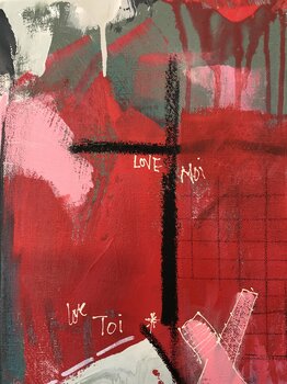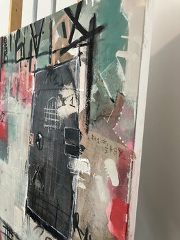 Dit groen, rood en wit kunstwerk gaat over vrede. We zoeken en bereiken weer vrede en dat wilde de kunstenaar vieren. Het gaat over eigenliefde en liefde voor de ander. De deur is zwart, maar het vertegenwoordigt het achterlaten van alle duisternis. De kunstenaar gebruikte verflagen die ze krabde om de lagen te eren. Ze gebruikte ook papier om alle texturen te mengen en te trouwen.