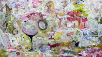 Dit schilderij is een open uitnodiging. Kom dichterbij, pak een glas en laten we proosten op de prachtige chaos van het leven. De heldere spetters, speelse vormen en zwevende glazen dansen samen – net zoals we doen wanneer we omringd zijn door fijne mensen en goede energie.