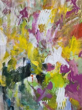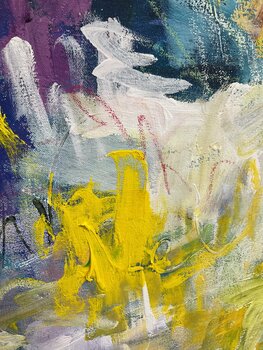 Mijn creatieve proces begint door een stuk primer canvas van de rol van 50 meter af te snijden en het aan de muur van mijn studio vast te pinnen. Ik voeg dan Gesso en overlay-textuur toe. Nog steeds met een leeg canvas kies ik het kleurenpalet op basis van mijn stemming van de dag. Ik begin… met schilderen door brede streken toe te passen op wat de achtergrond zal worden. Ik herhaal dit proces met lagen van verschillende kleuren, vormen, textuur en verschillende slagen. Met elke laag krijgt de stijl van het schilderij vorm. Bij sommige schilderijen is het creatieve proces ononderbroken totdat het is voltooid. Heel vaak heb ik de behoefte om te stoppen met schilderen en mijn ideeën te laten rijpen. Dit kan een paar uur of een paar dagen zijn. Ik ga uiteindelijk terug om het te verbeteren tot het punt waarop het aan mijn tevredenheid voldoet.